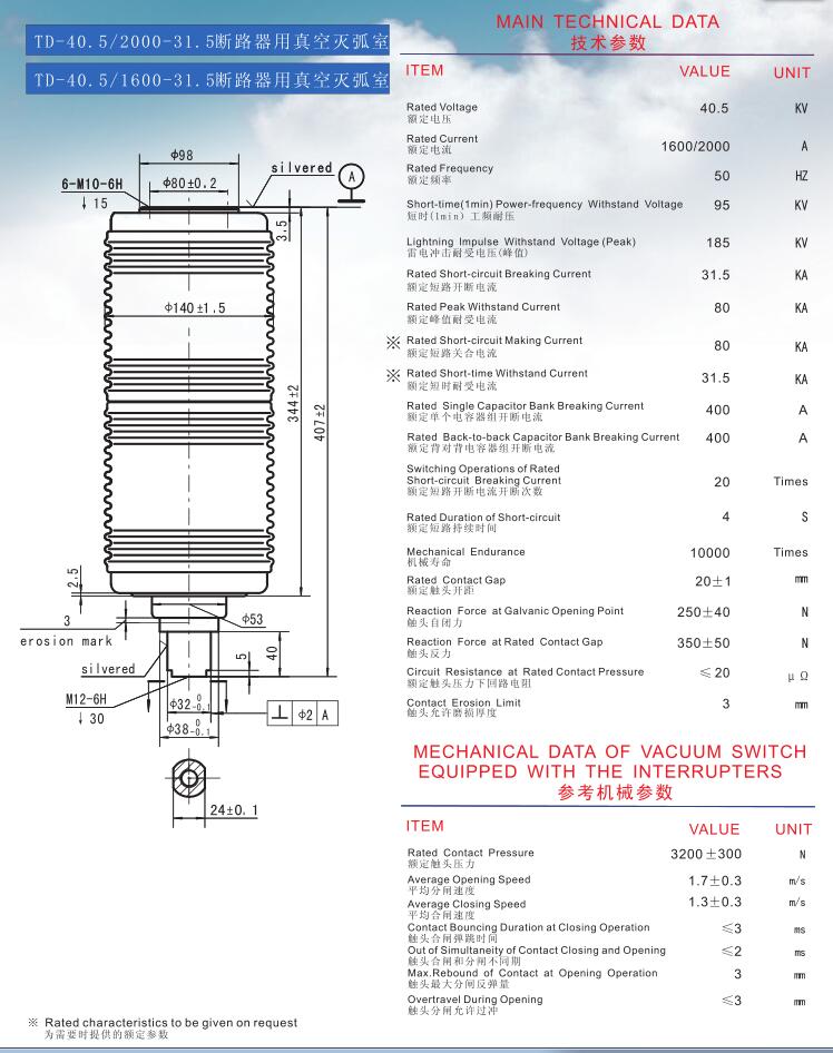TD-40.5/2000-31.5 40.5KV 1250A vacuum interrupters for Circuit Breakers